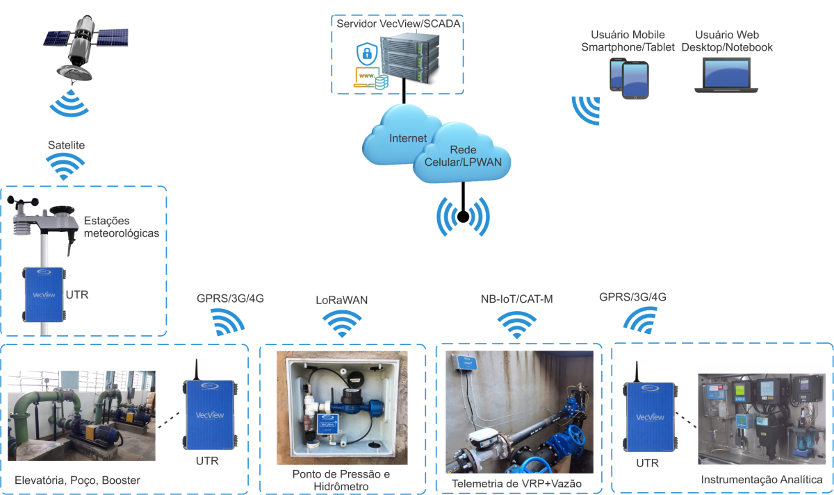 - Servidor VecView: Sistema central que realiza a aquisição de dados de todos os dispositivos/UTRs da aplicação, processa, armazena os dados em um banco de dados e disponibiliza interface para visualização e análise das informações através de recursos gráficos, intuitivos e georreferenciados, em mapa digital acessados através de navegador de internet universal;