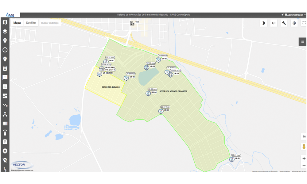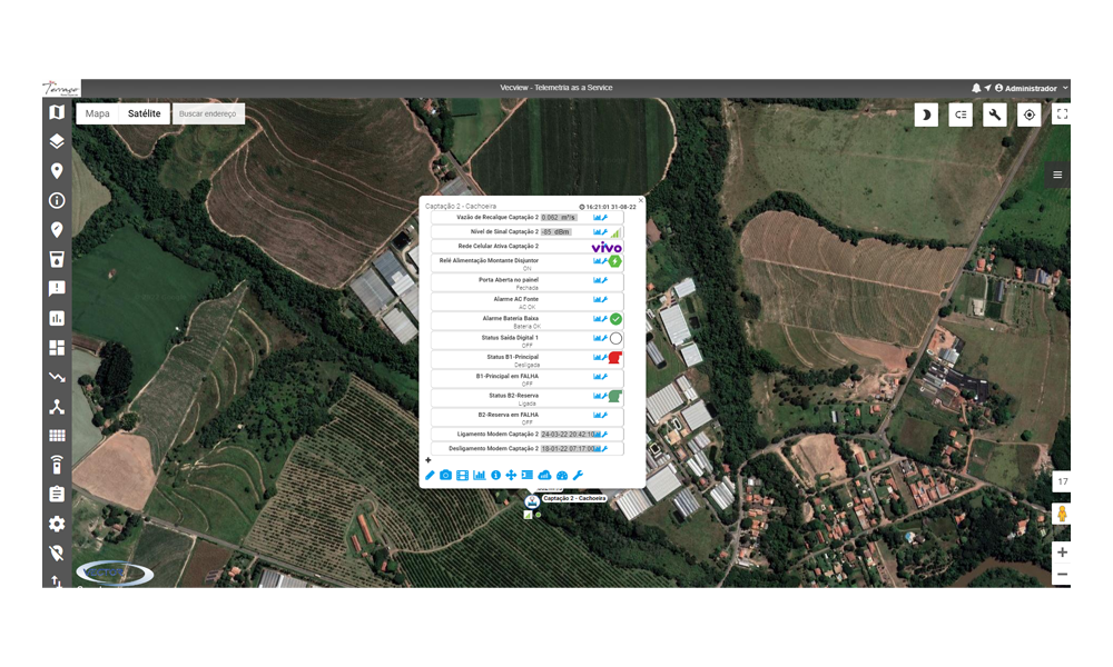- Servidor VecView: Sistema central que realiza a aquisição de dados de todos os dispositivos/UTRs da aplicação, processa, armazena os dados em um banco de dados e disponibiliza interface para visualização e análise das informações através de recursos gráficos, intuitivos e georreferenciados, em mapa digital acessados através de navegador de internet universal;