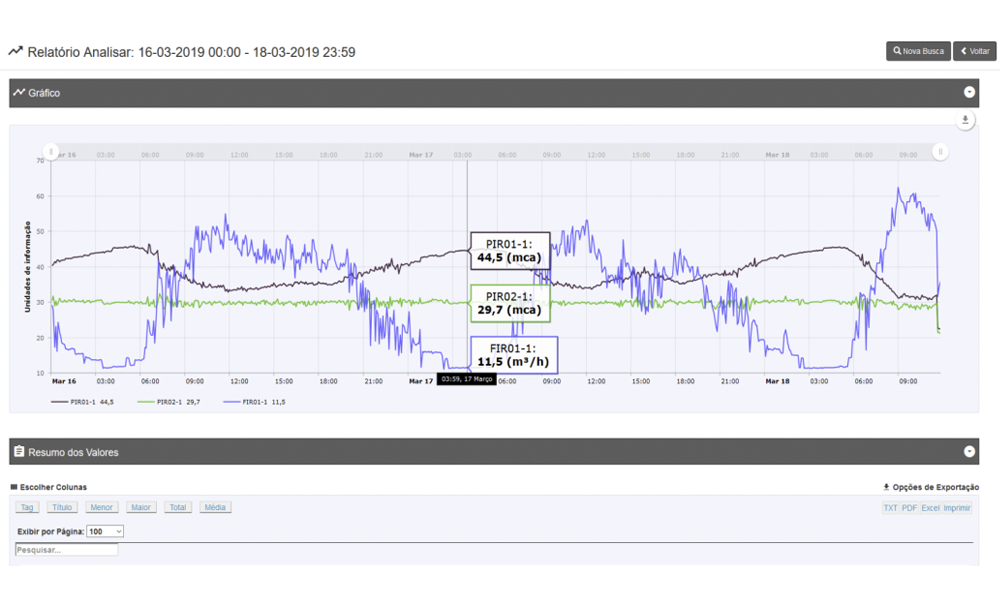 - Sumários de alarmes;